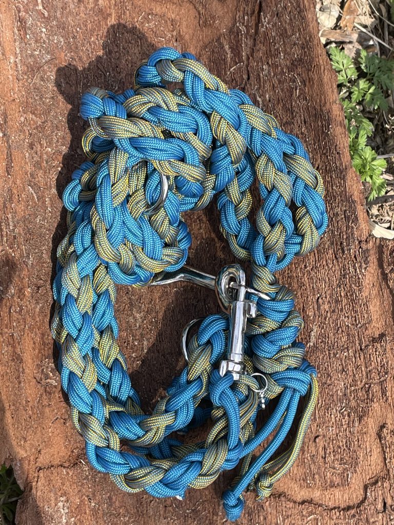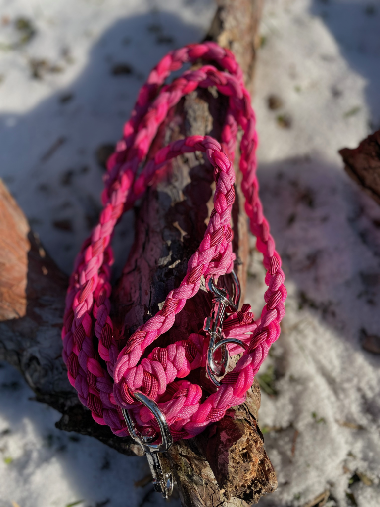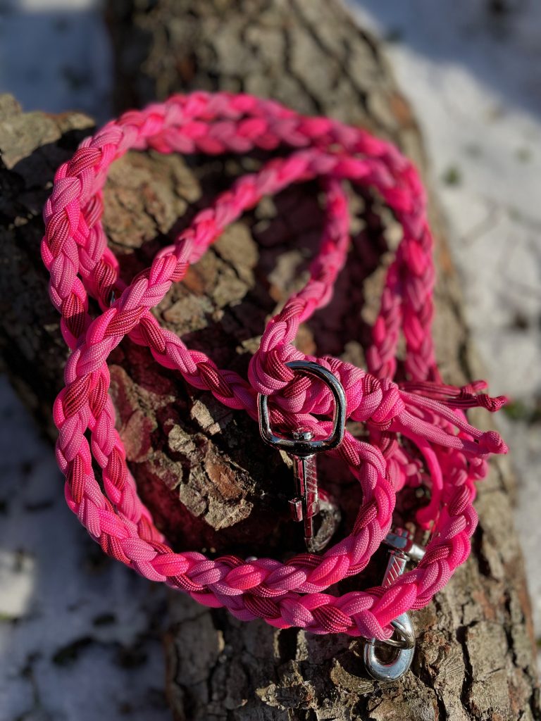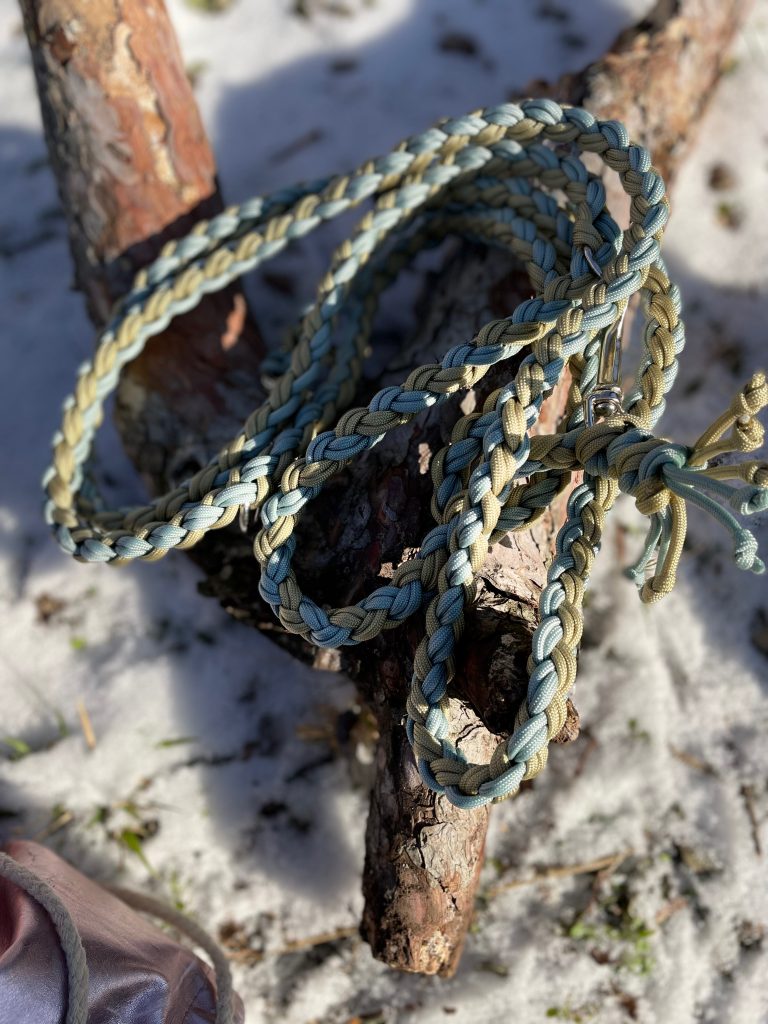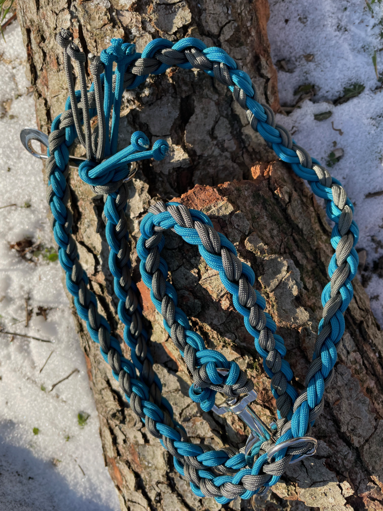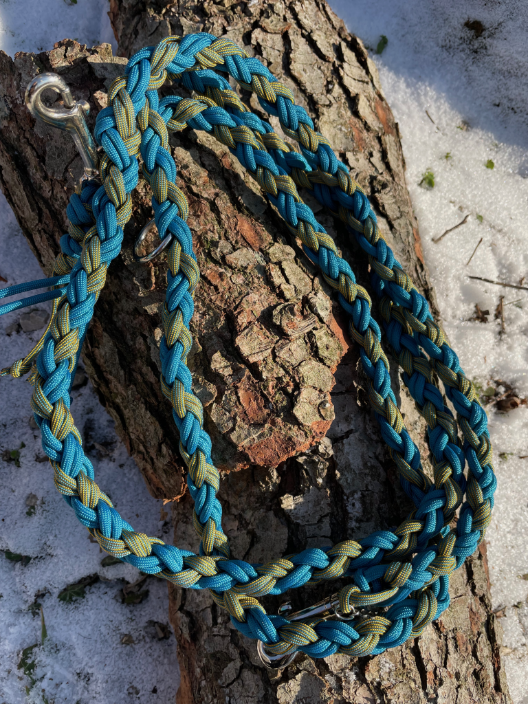 Als ich plötzlich ein Mitglied mehr in die Familie aufgenommen hatte, habe ich angefangen, selbst Leinen zu knüpfen. In allen möglichen bunten Farben, Längen und Varianten.