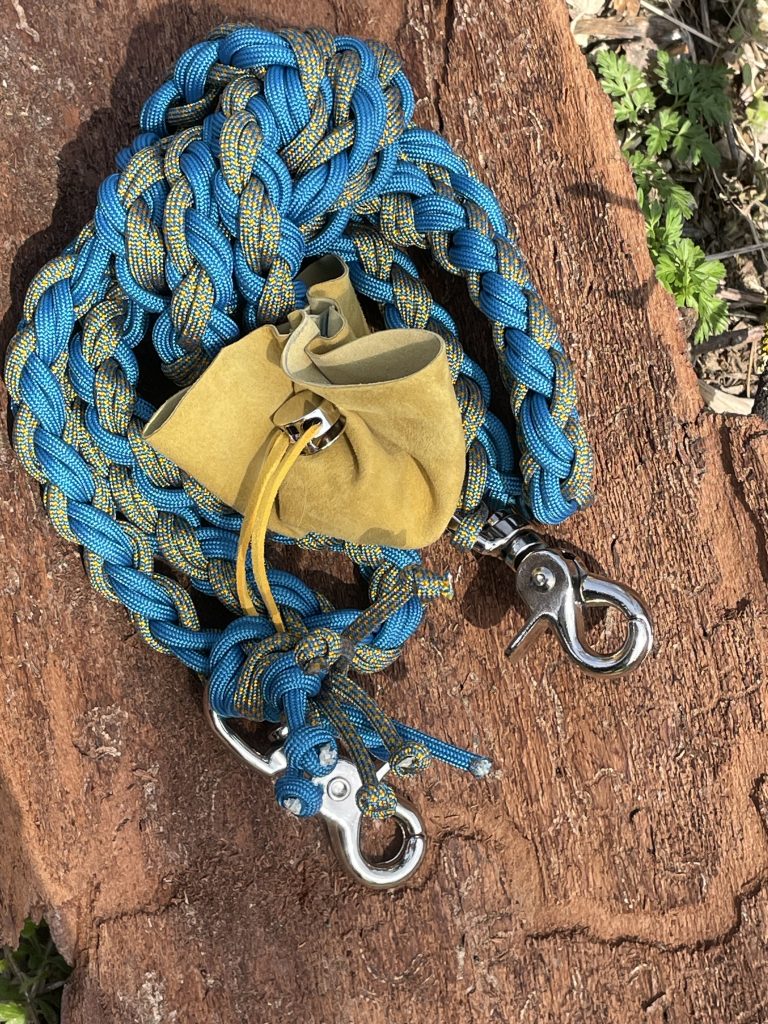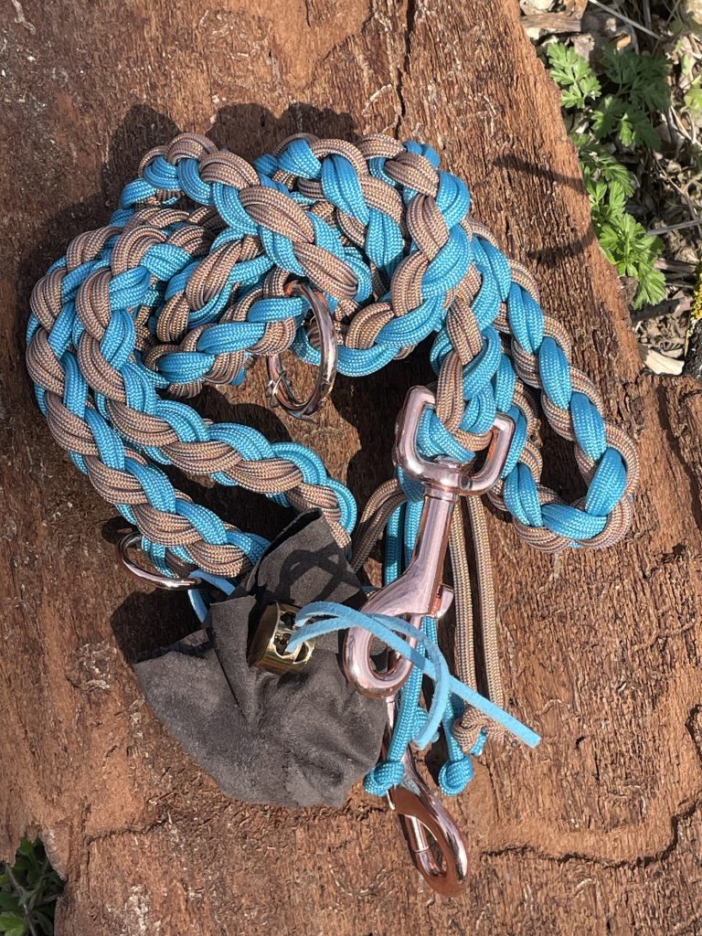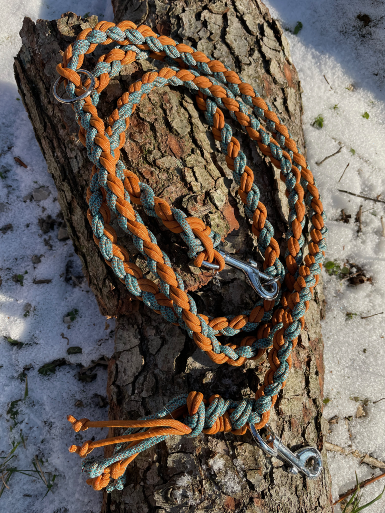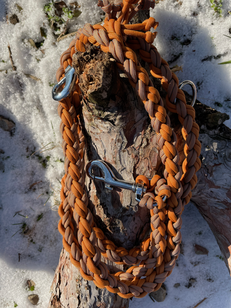 Die Leinen sind etwa 1,80 m lang und kommen mit zwei Karabinern und zwei Ringen – einem großen und einem kleinen. Auch Zugstopp-Leinen ohne Halsband fertige ich gerne für dich an.
