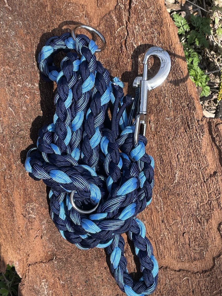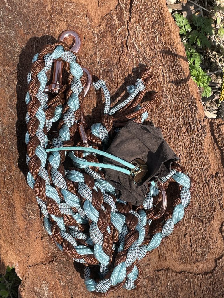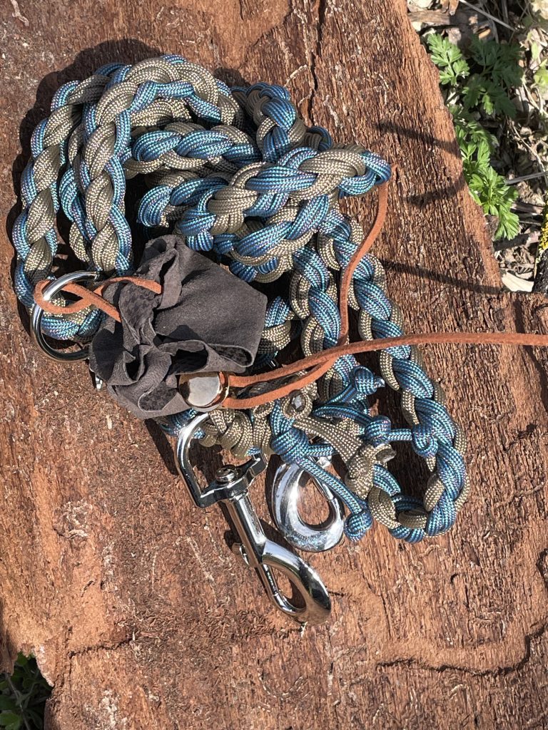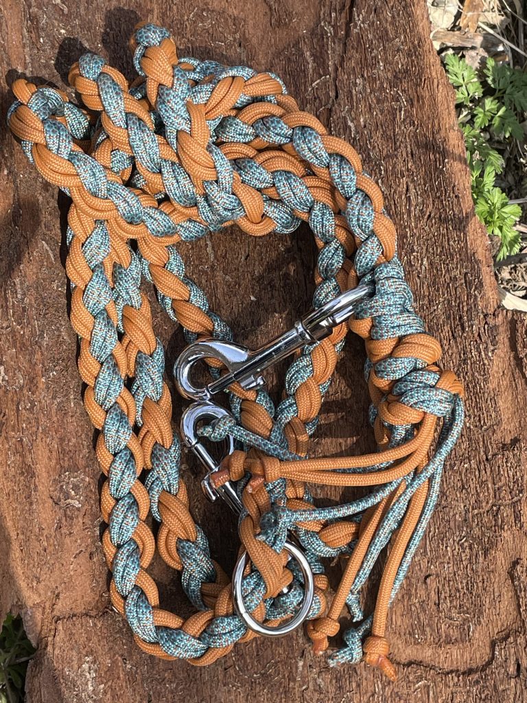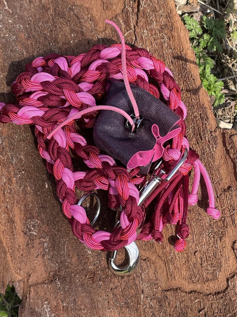 Die Leinen sind etwa 1,80 m lang und kommen mit zwei Karabinern und zwei Ringen – einem großen und einem kleinen. Auch Zugstopp-Leinen ohne Halsband fertige ich gerne für dich an.